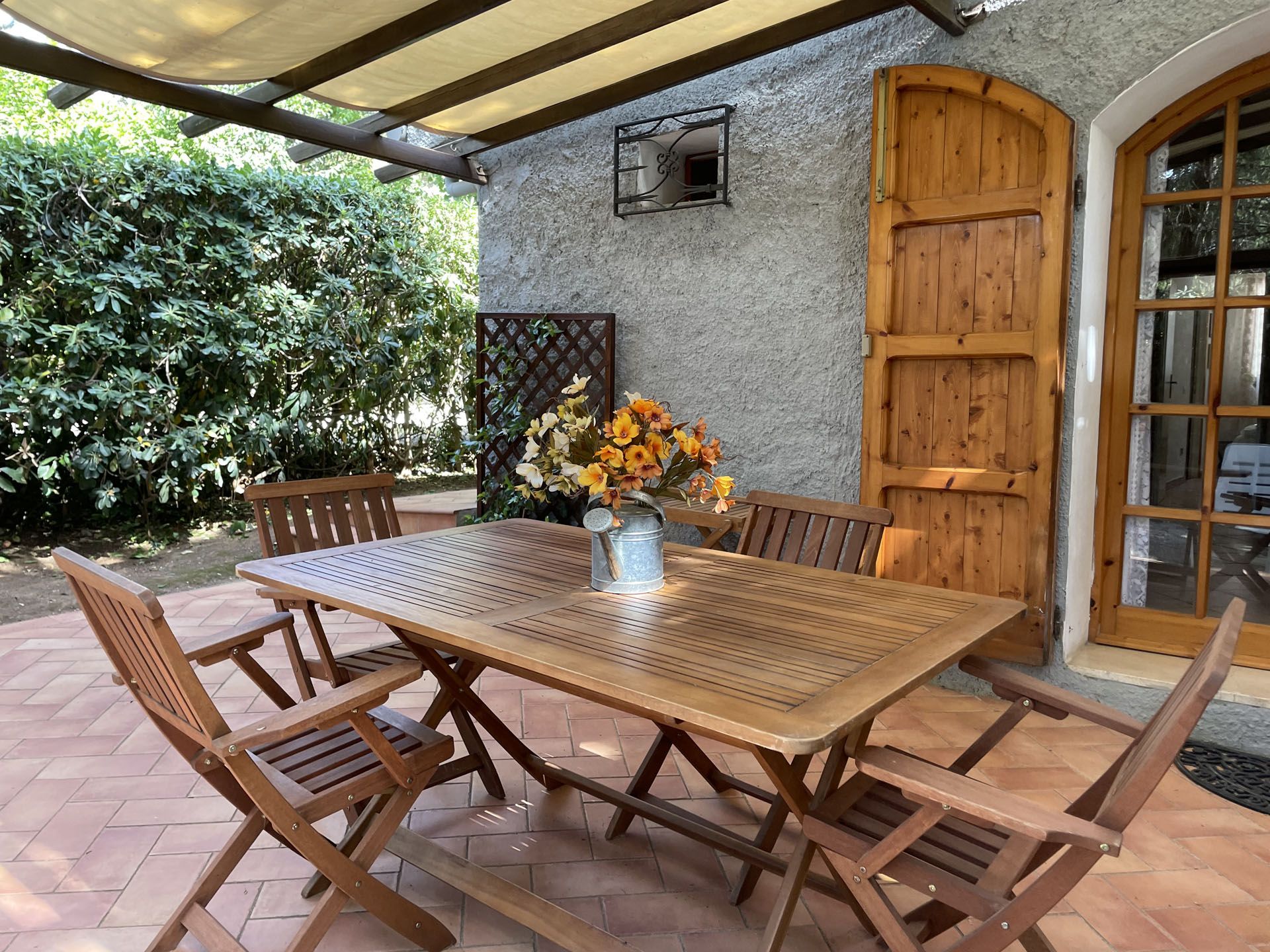 Ground floor flat with separate entrance and fully fenced private space. Outside veranda with table and chairs for eating outside, sun loungers, barbecue.