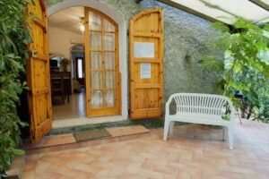 Outside veranda with table and chairs for eating outside, sun loungers, barbecue.